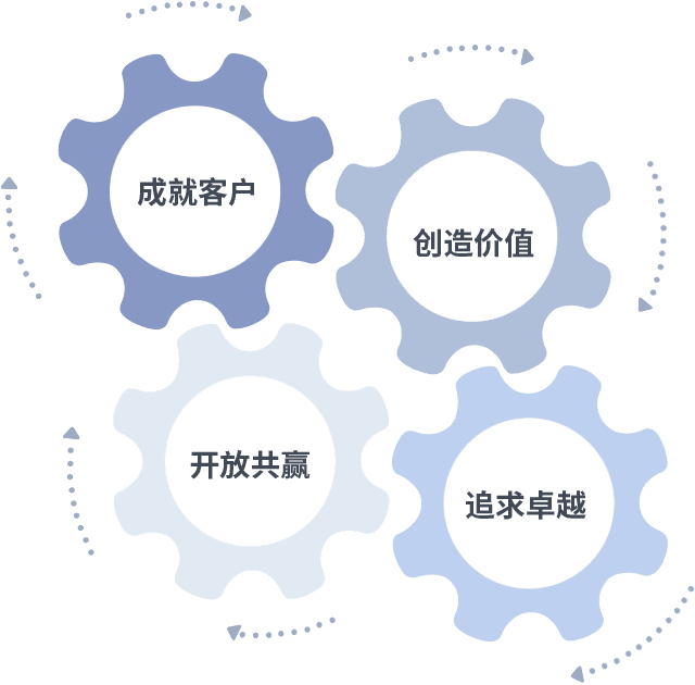 成就客户是一切决策的出发点,,,,创造价值是衡量所有工作的标准,,追求卓越是我们做事做人的态度,,,,开放共赢是我们的格局也是最终的结果。。价值观的齿轮环环相扣,,推动着组织里的每个人不断向前。。。。